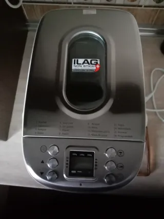 Panificadora con acabado en color blanco, ideal para preparar pan en casa. El modelo cuenta con un panel de control digital y múltiples programas. - Marca: ILAG - Modelo: Non Stick - Programas: Normal, Integral, Masa, Dulce, Yogur, Mermelada, Hervir, Masa para pizza, Masa para pasteles, Amasar, Masa de pan sin gluten, Espelta, Pastel, Programable. - Incluye cable de alimentación.