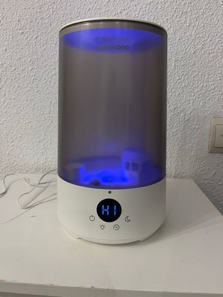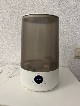 Humidificador de aire de la marca Homvana. - Diseño cilíndrico moderno. - Luz LED que va cambiando de colores integrada. - Pantalla digital con iconos táctiles. -Perfecto para humedecer la habitación cuando los niños tienen tos