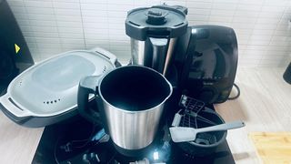 Robot de cocina Tefal Multicook Pro en color gris. Con IA. - Panel de control con pantalla digital. - Botón de inicio con luz roja. - Elegible diferentes modos de arroz. - Diseño moderno y compacto. - Fácil de limpiar. No tengo las instrucciones, pero las puedes conseguir por Internet. Tiene un pequeño arañazo en la pantalla y un pequeño bollo en el frontal pero no dificultades su buen funcionamiento. (Se ven en las 2 últimas fotos)