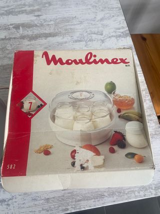 Yogurtera Moulinex en buen estado, lista para preparar tus yogures caseros. - Incluye 7 tarros de cristal con tapa. - Diseño compacto y fácil de usar. - Marca: Moulinex.