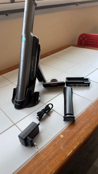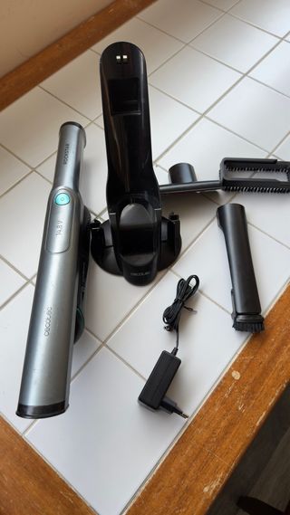 Aspiradora de mano Cecotec Rockstar en color gris. Incluye base de carga y accesorios. - Batería de 14.8V. - Diseño ligero y ergonómico. - Base de carga. - Cepillo para tapicerías. - Boquilla estrecha.