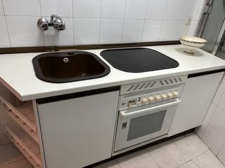 Conjunto de cocina en color blanco, ideal para renovar tu espacio. - Encimera con placa vitrocerámica. - Horno integrado. - Fregadero de color oscuro. - Muebles de cocina.