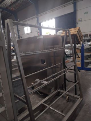 Carro para embutidos en forma triangular en acero inoxidable con ruedas. Medida: 191x150x75 Disponemos de una unidad en stock Si estás interesad@, envíanos un mensaje desde wallapop Solo recogida en tienda Respondemos de lunes a jueves de 8:00 a 14:00 y de 16:00 a 18:30 y viernes de 8:00 a 14:00
