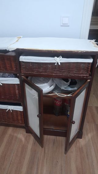 Mesa de planchar con estructura de madera oscura y tres cestas de mimbre para almacenaje. Ideal para organizar la ropa. Tiene una superficie de planchado amplia y cómoda. - Estructura de madera. - Tres cestas de mimbre. - Superficie de planchado.
