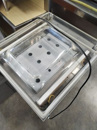 Envasadora al vacío DZ300T de Eutron nueva a estrenar con una barra de soldadura de 300mm y un ancho de soldadura de 8mm. Medida de la cámara: 320x380x57mm Voltaje: AC220V Ciclo por minuto: 2-3 Potencia: 370w Peso: 43kg Medida: 370x500x380mm Disponemos de varias unidades en stock Su precio es de 875€ +IVA Si estás interesad@, envíanos un mensaje desde wallapop Los envíos se harán a través de agencia de transporte o recogida en tienda. Respondemos de lunes a jueves de 8:00 a 14:00 y de 16:00 a 18:30 y viernes de 8:00 a 14:00