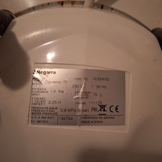Termo eléctrico de la marca Negarra, ideal para calentar agua. - Color blanco. - Panel de control con selector de temperatura y piloto. - Conexiones inferiores para agua fría y caliente. - Se encuentra en perfecto estado.