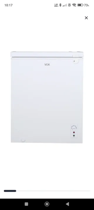 Congelador horizontal de la marca VOK con una capacidad de 137 litros. Su diseño es blanco y compacto, ideal para optimizar el espacio. - Capacidad: 137 litros. - Color: Blanco. - Marca: VOK.