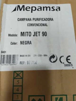 Campana purificadora convencional Mepamsa. - Modelo: MITO JET 90 - Color: Negra - Fabricada en CEE - Voltaje: 220-230V - 50Hz