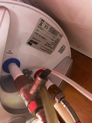 Termo calentador de agua de color blanco. - Incluye termómetro. - Pegatina de advertencia e instrucciones.