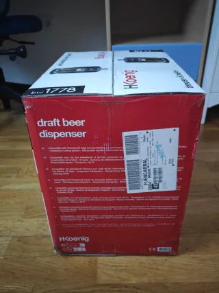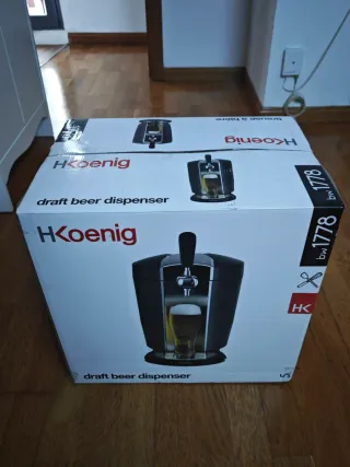 Grifo dispensador de cerveza H.Koenig SIN USAR y en su caja original. - Compatible con barriles universales de 5 litros. - Sistema de enfriamiento integrado que mantiene la temperatura entre 3ºC y 6ºC. - Pantalla LED y un recipiente de residuos fácil de limpiar. - Potencia: 65 W.
