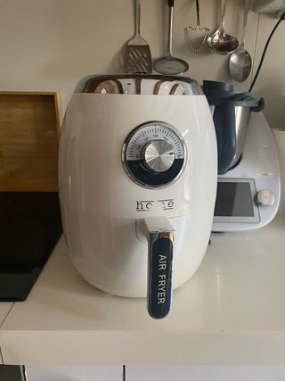 Freidora de aire en color blanco, con un diseño moderno y elegante. - Panel de control con dial. - Asa para extraer la cesta. - Indicador de temperatura.