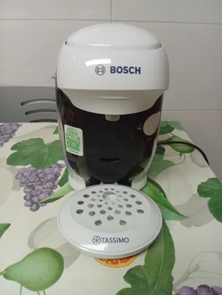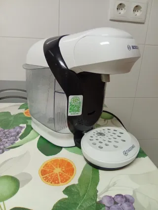 Cafetera de cápsulas Bosch Tassimo en color blanco y negro. Ideal para preparar tu café favorito. - Diseño compacto. - Marca Bosch. - Sistema Tassimo.