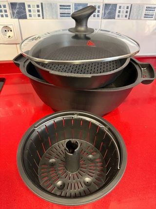 Olla programable Cooker Matic con múltiples funciones. Ideal para preparar una gran variedad de platos. - Panel de control digital. - Programas preestablecidos: Arroz, Sopa, Postre, Pasta, Autolimp, Guiso, Yogurt, Lento. - Funciones: Horneado, Vapor, Plancha. - Color: Acero inoxidable y blanco.