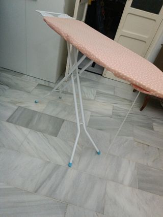 Tabla de planchar estrechita. Funda rosa, con signos de uso. Plegable