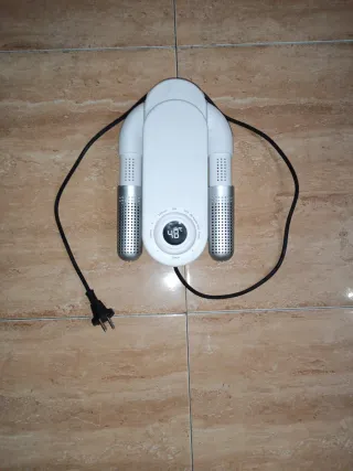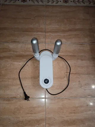 Máquina eléctrica para secar y eliminar mal olor de diversos artículos como guantes, zapatillas, etc. ; Su diseño blanco y plateado le da un aspecto moderno. - Dos tubos de secado. - Pantalla digital con temperatura. - Cable de alimentación incluido.
