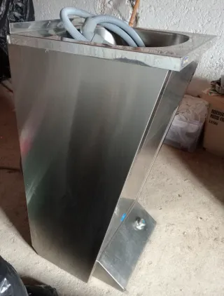 Lavamanos de pie fabricado en acero inoxidable, con conexión para agua fría y caliente. - Diseño moderno y funcional. - Material resistente y fácil de limpiar. - Con los tubos para su conexión - puerta delantera
