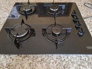 Placa de gas Beko de cristal negro con 4 quemadores. Tiene 2 años de uso. - Encendido electrónico. - Parrillas de hierro fundido. - Válvula de seguridad.