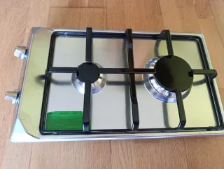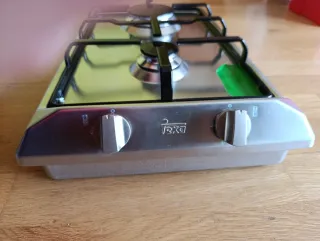 Placa de gas de dos fuegos, en excelente estado y con poco uso. - Acabado en acero inoxidable. - Parrillas de hierro fundido. - Mandos frontales. - Marca: Teka