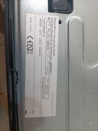 Placa de inducción de la marca Bosch. 7400W de potencia. Presenta una pequeña rotura en la esquina por golpe, solo estético. No tiene ningún problema de funcionamiento. Modelo BOSCH PID651FC1E 60cm. Valor de mercado 600€ aprox. Precio negociable