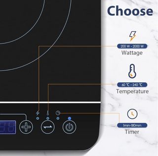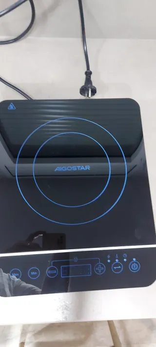 Placa de inducción portátil de la marca Aigostar. Diseño moderno y compacto. - Potencia de 2000W. - Superficie de vitrocerámica negra. - Panel de control digital con pantalla LED. - Botones táctiles para ajuste de potencia y tiempo.
