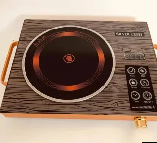 Placa de inducción portátil SILVERCREST, ideal para casa, camping o segundas viviendas. Fácil de usar y muy práctica. Características: -1 fuego -10 niveles de potencia y temperatura (200–2000 W / 60–240 °C) -Temporizador hasta 180 minutos -Apta para ollas y sartenes con base magnética hasta 26 cm -Sensor de seguridad: se apaga automáticamente si no detecta recipiente -Panel de control táctil con 6 botones (potencia, temporizador, +, −, bloqueo infantil y ON/OFF)