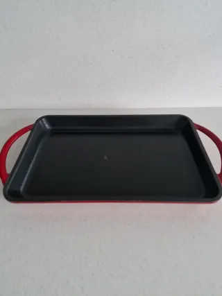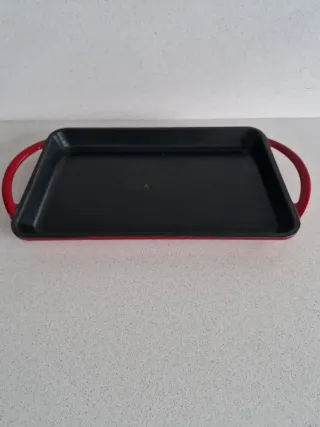 Plancha de cocina apta para placas de inducción. Su diseño rectangular extiende el calor de forma homogénea. Sus asas de silicona extraíbles la hace práctica y fácil de manejar. - Firma: Royalty Line. - Superficie antiadherente. - Asas ergonómicas extraíbles de color rojo. - Apta para placas de inducción y hornillos de gas butano. - Medida diámetro: 21,5 cm. Detalle de medidas totales en las imágenes. - Va en su caja original. Disponible en Churriana de la Vega (Granada). Hago envío. Soy un particular.