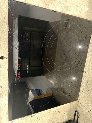 Placa Induccion Siemens model EH651FDC1E. Sigue funcionando hace falta cambiar el cristal. O Recambio Zonas de cocción: Dispone de tres zonas de inducción: Una zona pequeña de 14,5 cm de diámetro. Una zona mediana de 21 cm de diámetro. Una zona gigante triple de 32 cm de diámetro, perfecta para paellas u ollas grandes. Control touchSlider: Permite controlar los 17 niveles de potencia de cada zona simplemente deslizando el dedo sobre la barra de control. Frying Sensor: Incorpora un control inteligente de la temperatura del aceite con 4 niveles, lo que ayuda a cocinar los alimentos de manera uniforme sin que se quemen. Función Boost.