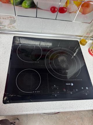 El cristal está quebrado pero la placa funciona. Placa vitrocerámica de inducción Fagor con superficie de cristal. - Marca: Fagor - Tipo: Vitrocerámica de inducción - Material: Cristal - Zonas de cocción: 3 - Tecnología: InductionPlus