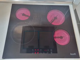 Placa vitrocerámica de cuatro fuegos con control digital. Tiene 4 fuegos, funcionan 3,se ve en la foto.y un pequeño golpe en la esquina izq(ver ultima foto) - Diseño moderno en cristal negro. - Indicadores LED de calor. - Marca: Kunft.