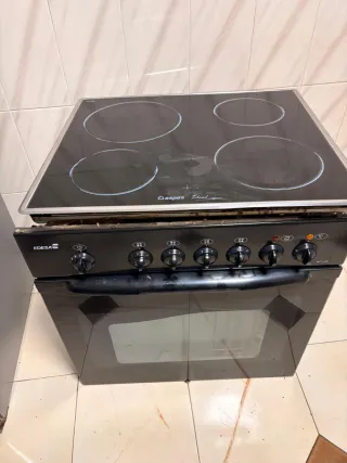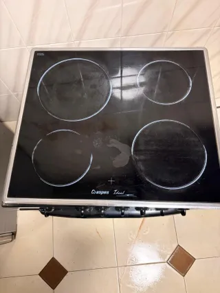 Conjunto de placa de inducción y horno. - Placa de inducción. Tiene una esquina que se ha rajado pero no afecta nada al funcionamiento. Tiene fuego grande y dos pequeños que pueden poner juntos para plancha. - Horno integrado.