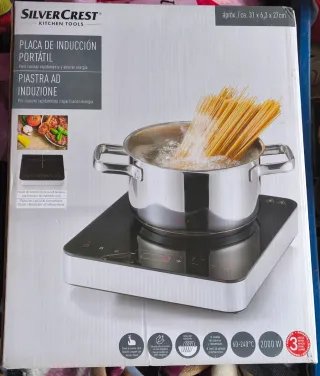 Placa de inducción portátil SilverCrest Kitchen Tools. Ideal para cocinar de forma rápida y eficiente. - NUNCA SE HA USADO. - 10 niveles regulables de potencia y temperatura. - Bloqueo infantil. - Sensor de ollas y sartenes integrado. - Apta para ollas y sartenes de inducción de entre 12 y 22 cm de diámetro. - Diseño compacto y moderno. - Superficie de cocción lisa y fácil de limpiar. - Controles intuitivos. - Ahorro de energía. - Potencia: 2000 watios. - Rango temperatura: 60°C - 240°C