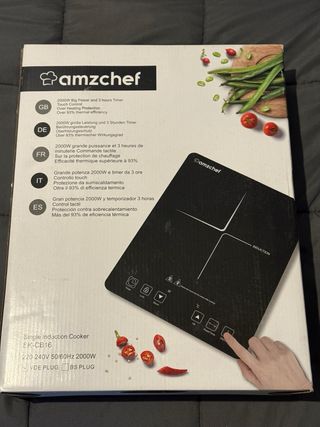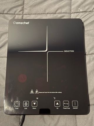 Placa de inducción portátil de la marca Amzchef. Diseño moderno y compacto. - Superficie de vitrocerámica. - Controles táctiles. - Indicador de calor residual.