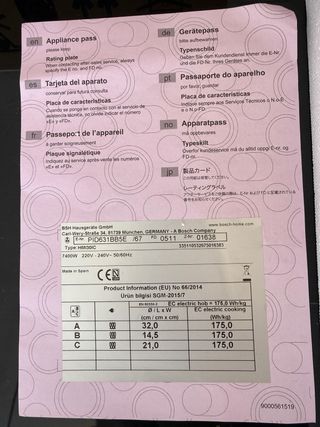 Placa de inducción Teka modelo IBC 63110 SSM BK. - Tipo: MC-17454A1-AD. - Voltaje: 220-240V. - Frecuencia: 50Hz o 60Hz. - Potencia: 7400 W. - Fabricada en China.
