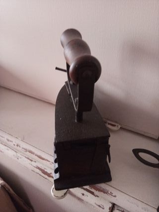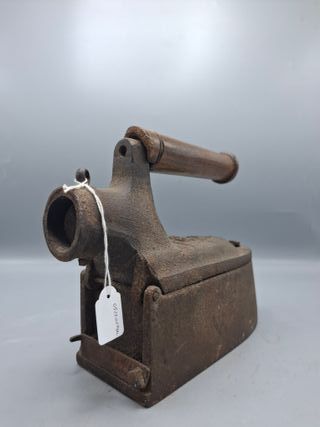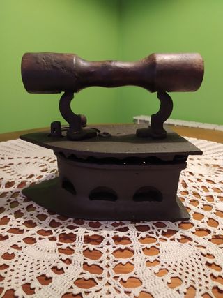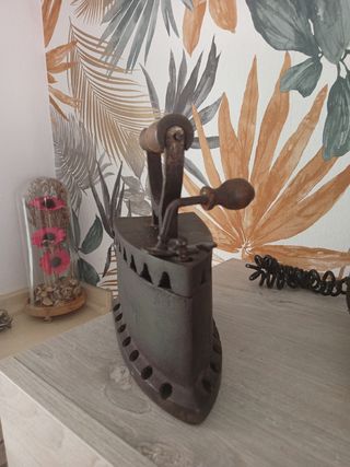 Plancha de hierro fundido, ideal para coleccionistas o decoración. - Mango de madera. - Compartimento para carbón.