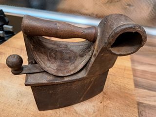 Plancha de hierro antigua, ideal para coleccionistas o como elemento decorativo. - Fabricada en hierro fundido. - Mango de madera. - Diseño clásico de plancha a carbón.