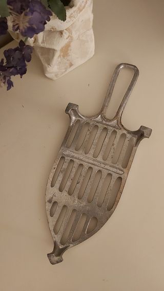 Antigua reposa plancha de metal plateado de principios del S. XX. Servía para el descanso de la plancha de carbón y no quemar la ropa. Tiene las típicas señales del paso del tiempo y el uso. Medidas: Largo: 27 cm. Ancho: 11 cm. (de patita a patita). Una bonita pieza vintage para decoración.