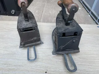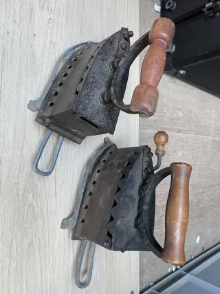 Conjunto de dos planchas antiguas de hierro, ideales para coleccionistas o decoración. - Fabricadas en hierro fundido. - Mangos de madera. - Diseño clásico de plancha de carbón. NO HAGO ENVIOS