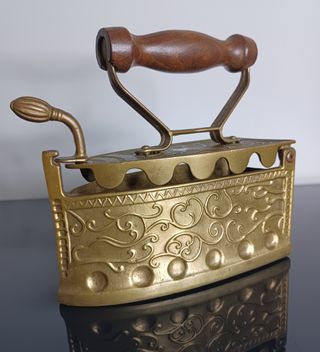 Exclusiva plancha de carbón antigua, una pieza de colección con un cuerpo de latón dorado patinado y un asa de madera torneada. A diferencia de las utilitarias, esta plancha de estilo francés del siglo XIX o principios del XX se creó para ser una pieza de exhibición, ideal para decoración. Sus grabaciones ornamentales únicas y su ligero peso de 1.057 grs. la convierten en un objeto de gran valor estético e histórico. Se encuentra en excelente estado de conservación. Medidas: 16x7x16 cm. Su valor reside hoy en su belleza estética, su antigüedad y su excelente estado de conservación, lo que la convierte en una adquisición ideal...!