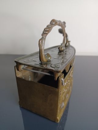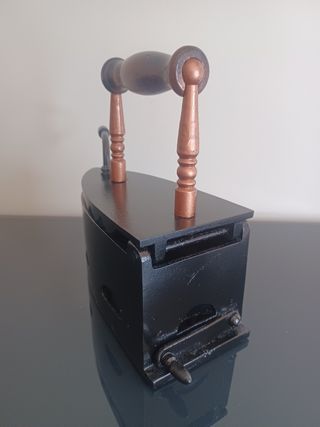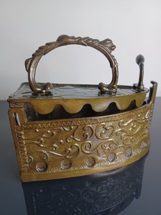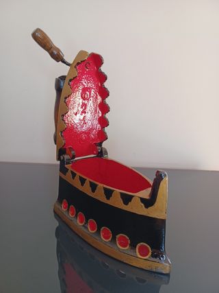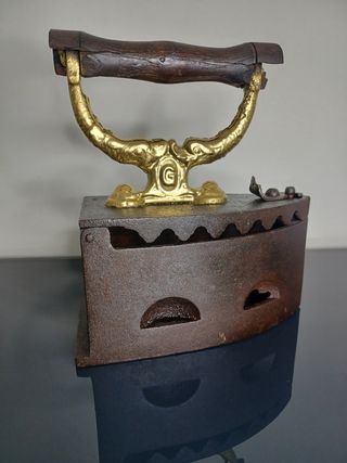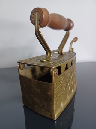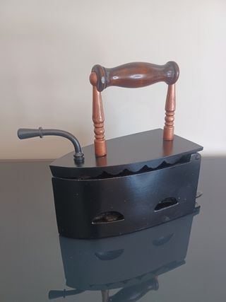 Auténtica plancha de carbón de hierro fundido con asa de madera, una joya para coleccionistas y amantes de la decoración vintage o rústica. La pieza fue adquirida en un anticuario, lo que garantiza su autenticidad y valor histórico. Material: Hierro fundido y asa con empuñadura de madera. Medidas (aprox.): 17 cm de alto (incluyendo el asa) x 14 cm de ancho. Recipiente para carbón de 14 x 7 cm. Estado: Buen estado de conservación, con la pátina original y marcas del paso del tiempo que le otorgan carácter. El mecanismo de apertura se ha soldado con el tiempo.