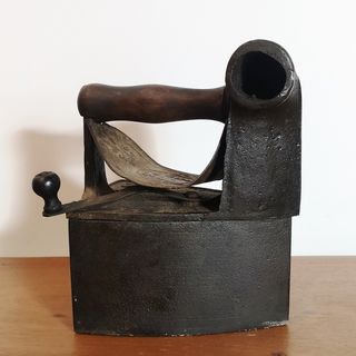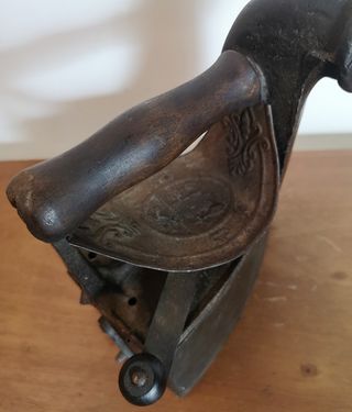 Plancha de carbón antigua, ideal para coleccionistas o decoración. - Fabricada en hierro fundido. - Mango de madera. - Diseño clásico.