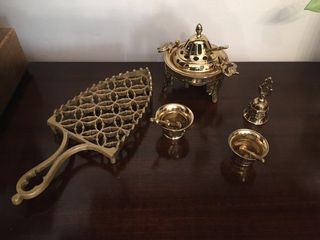 Lote de brasero antiguo,morteros,campanilla (le falta la pesa) y apoyo de placha antigua de carbón. Todo en muy buen estado. El apoyo de plancha habría que limpiarlo.