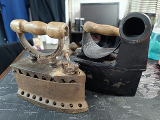 Dos planchas de hierro antiguas, perfectas para coleccionistas o decoración. - Fabricadas en hierro fundido. - Con mangos de madera. - Diseño clásico y robusto. PRECIO POR LAS 2