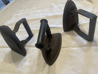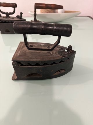Tres planchas de hierro antiguas, en buen estado de conservación. Son ideales para decoración o coleccionismo. Perfectas si se quiere como aguanta-libros - Tres planchas de diferentes tamaños y estilos. - Hechas de hierro fundido. - Presentan señales de uso y pátina del tiempo, lo que les da un encanto especial.