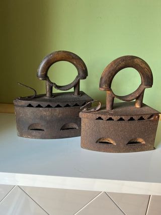 Conjunto de dos planchas de hierro antiguas, tamaño número 4. Piezas con un diseño clásico y robusto. - Material: Hierro fundido. - Mango curvo para un agarre cómodo. - Base ancha y plana.