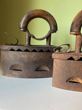 Conjunto de dos planchas antiguas de hierro, ideales para coleccionistas o decoración. - Fabricadas en hierro fundido. - Mangos de madera. - Diseño clásico de plancha de carbón. NO HAGO ENVIOS