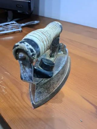 Plancha antigua de hierro fundido con un diseño clásico y un mango de madera. Se calentaba por electricidad, no tengo el accesorio Se vende como decoración - Material: Hierro fundido. - Mango: Madera. - Diseño: Clásico. Base 14 cm x 8 cm alto con asa 12 cm