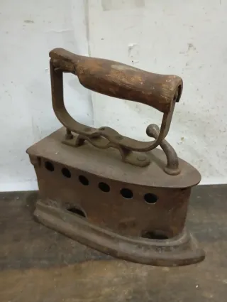Pieza de colección, plancha antigua de hierro fundido. - Diseño clásico con detalles ornamentales. - Asa de madera. - Base con orificios para ventilación.