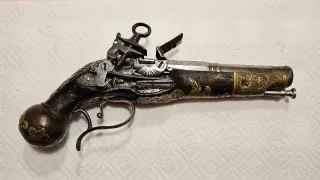 Pistola antigua de avancarga de finales siglo XVII, originaria de Ripoll. Una pieza de alta colección. En la época se utilizava como protección personal. Presenta detalles ornamentales labrados en latón en la empuñadura, culata y en el cañón. Mecanismo de chispa visible. Tambien llamado mecanismo de Miquelet. No dispara, es una pistola antigua de colección. - Fabricación: Ripoll i Cataluña - Época: Siglo XVII - Materiales: Madera de nogal, hierro y metal dorado (latón labrado, incisiones sobre plancha de latón). Ver fotos. Longitud total pistola: 30 cm Longitud cañón: 17,1 cm Diametro interior cañón: 19 mm