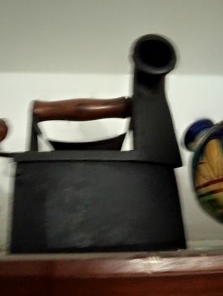 Preciosa plancha antigua, ideal para coleccionistas. Es pequeña y parece estar hecha de hierro. - Plancha de hierro. - Diseño antiguo y rústico. - Mango de madera.