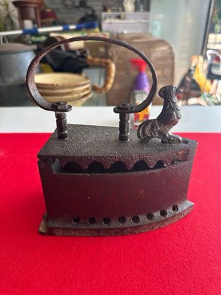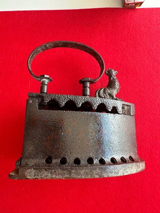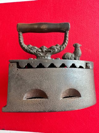 Plancha antigua de hierro fundido, utilizada para planchar con carbón. Presenta un diseño clásico con un asa de madera y un detalle decorativo de un gallo en la parte superior. Finales de los años 20 - Material: Hierro fundido y madera. - Diseño: Clásico con gallo decorativo. - Uso: Planchado con carbón.